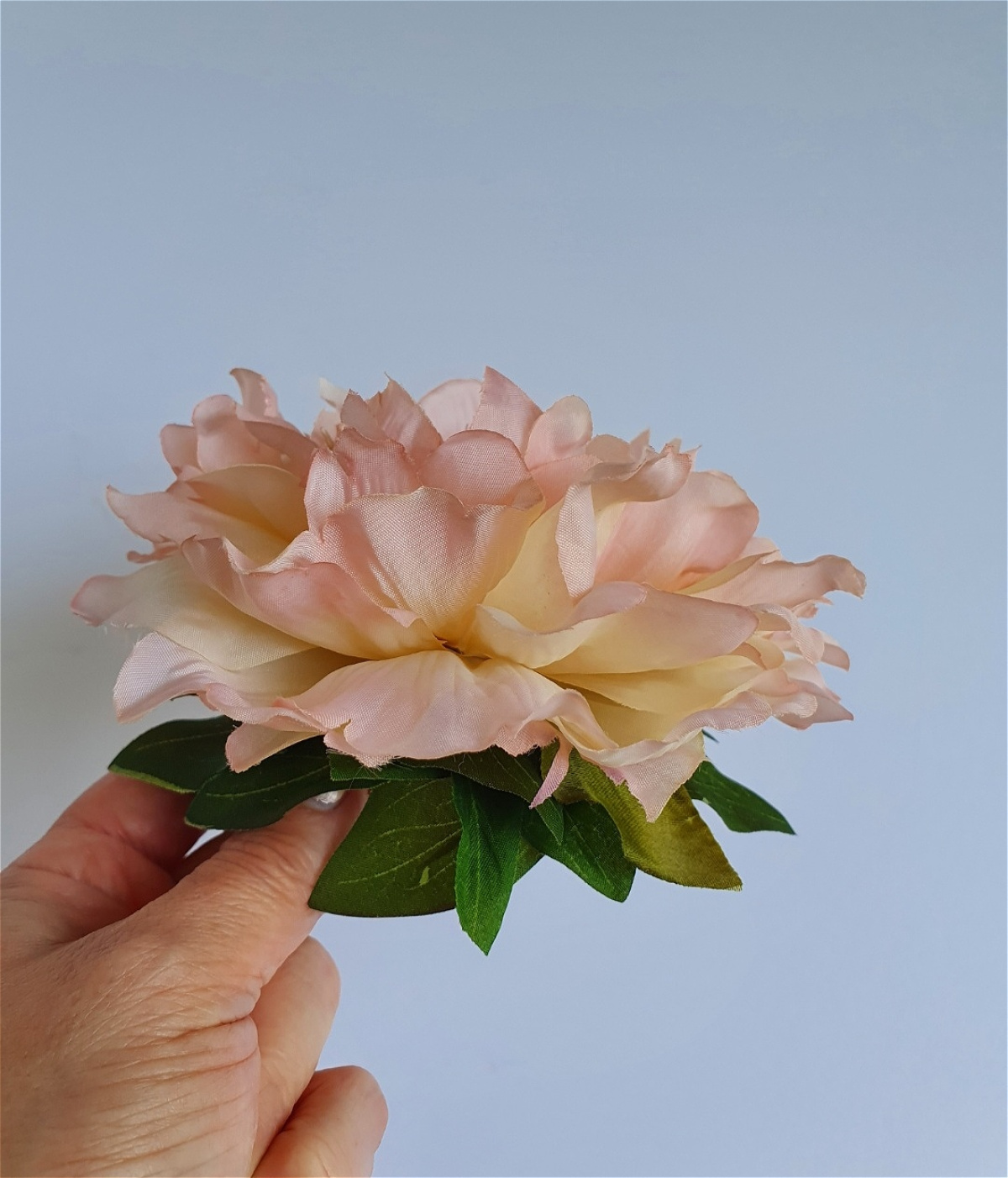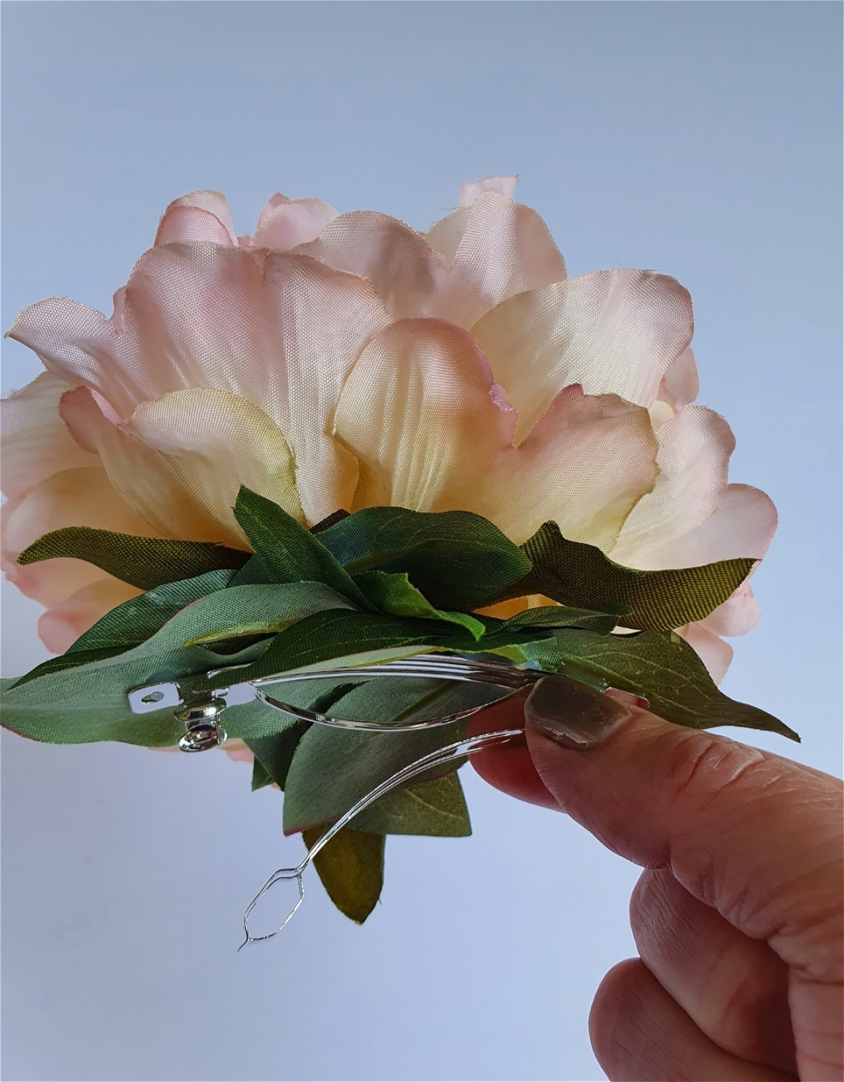 Peachy Pink Dahlia Hair Clip. Hair clip decorated with a lovely artificial Dahlia with leaves.
